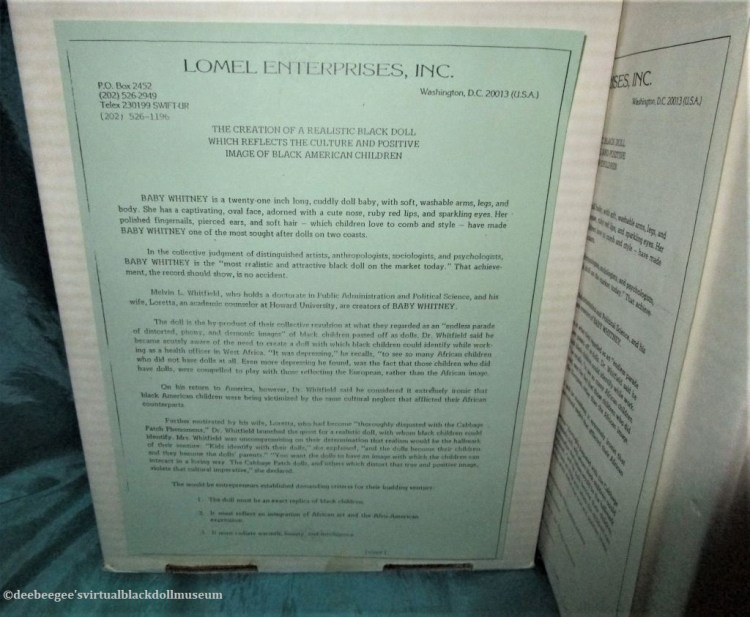 Other: A description of Baby Whitney is attached to the inside of the doll’s box. Attached to the back of the box is a two-page, detailed account of Baby Whitney’s creation, written by the creators, Melvin and Loretta Whitfield. The married couple, disgusted with the then-current play-doll offerings for black children, was determined to create a realistic-looking black doll that black children could identify with.