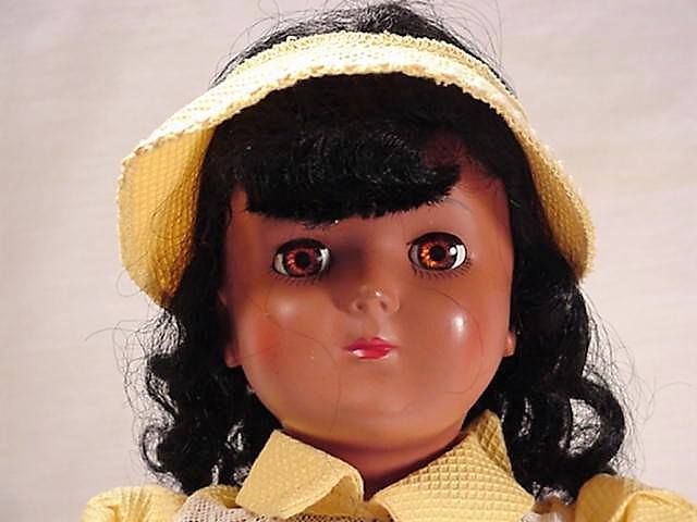 Clothes: All original yellow Dotted Swiss dress and matching bonnet, white panties, white socks, and permanently-placed shoes that have rollers underneath