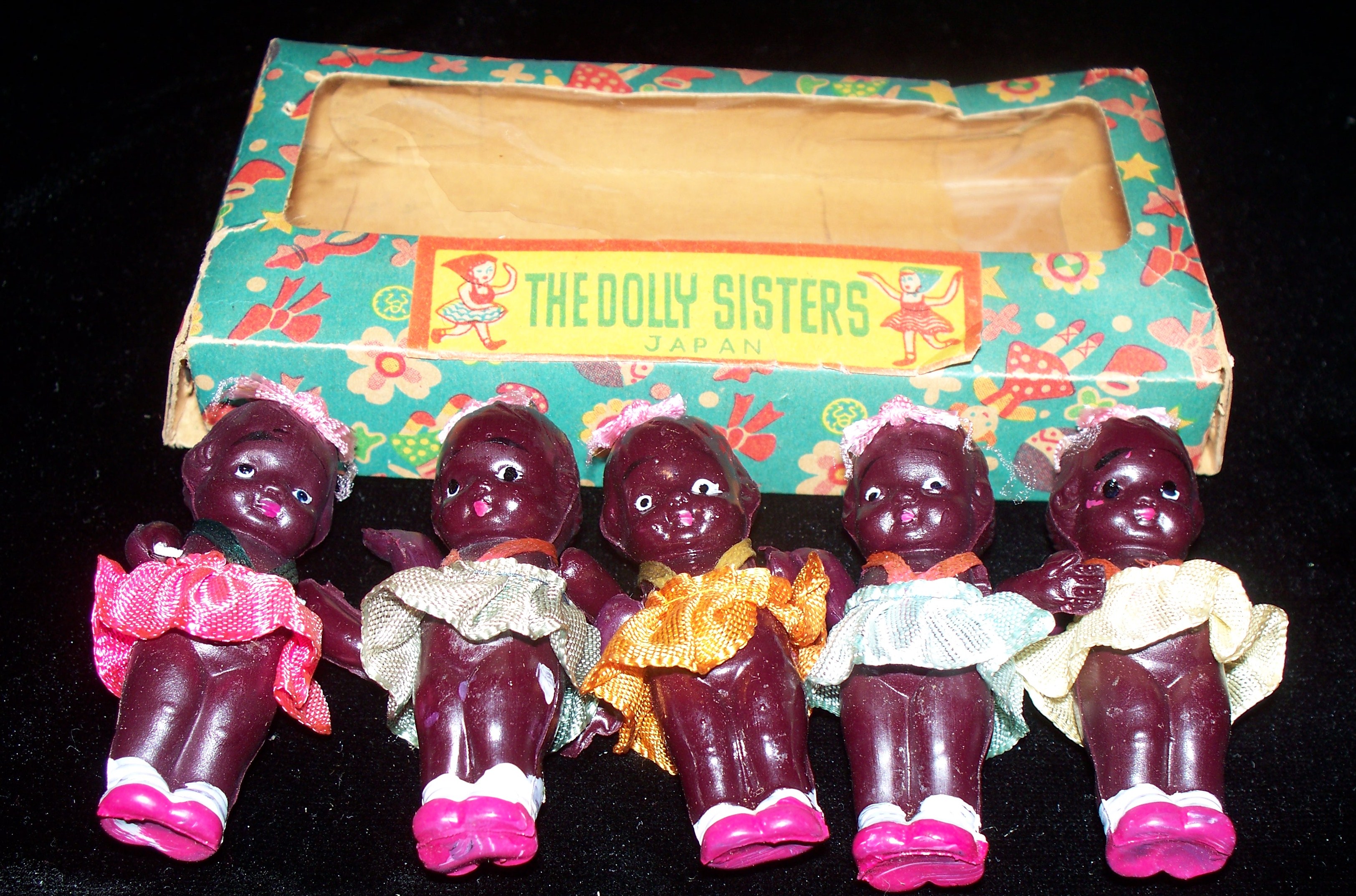 Other: The set includes five celluloid dolls. Celluloid dolls were outlawed in the United States during the 1930s due to the flammability of celluloid.
