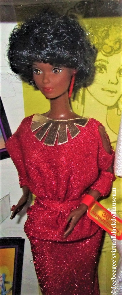 Clothes: Red two-piece shimmery top and skirt. The skirt is longer than the first Black Barbie’s skirt. The top has gold lamé accents attached to the neckline, but these are shaped differently than the first doll’s accents. Wears red pump heels, and a red ring and necklace. Extra fashion of a white disco-style pants suit, gold lamé shoulder bag, white high heels.