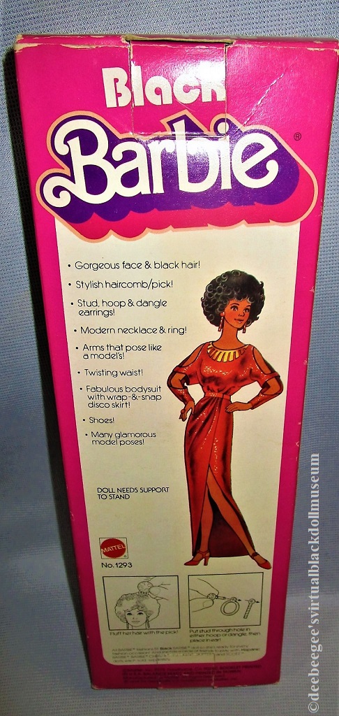 Other: An Afro pick is the only accessory. This is the first Black doll to be given the name Barbie. All other Black dolls made before this doll were friends of Barbie, i.e. Christie, Barbie’s modern cousin “Colored” Francie, and Julia (not a friend of Barbie but released during the vintage Barbie era. This doll uses the Steffie head sculpt. The doll’s signature statement is on the lower front of the box, “She’s black! She’s beautiful! She dynamite!”