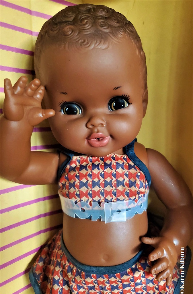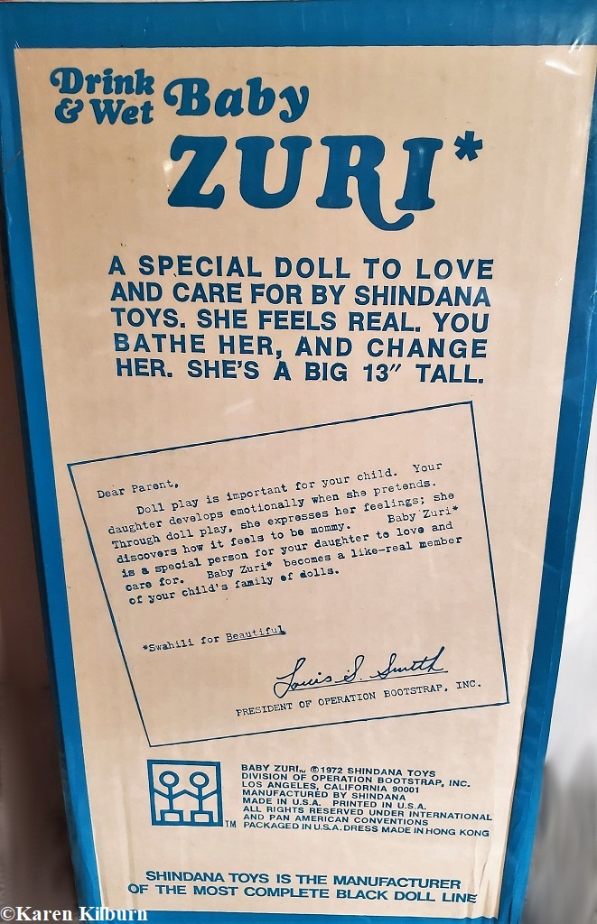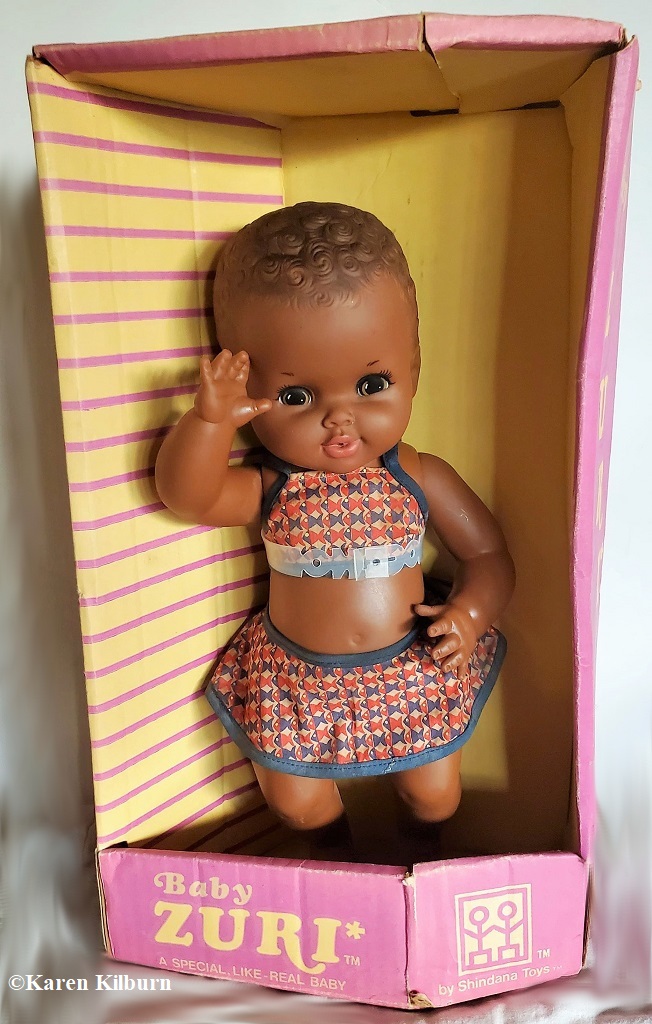 Other: Baby Zuri is a girl but is often mistaken for a boy. Zuri means beautiful in Swahili. The Baby Zuri head sculpt was also used for later version of Shindana’s Baby Nancy. Released in different shades of brown, a white Baby Zuri was also available as indicated on the box in slideshow image 10.