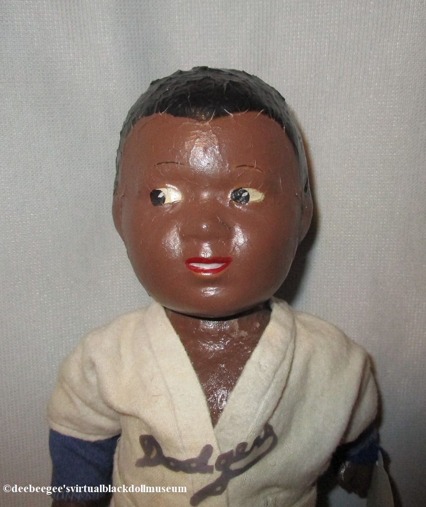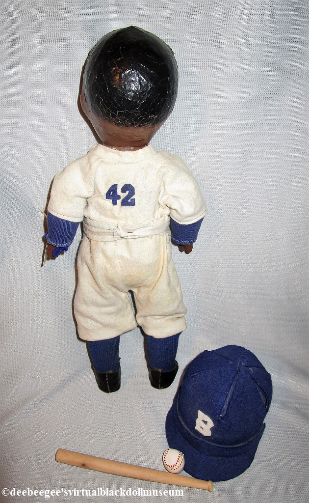 Other: Dodgers is spelled out on the front of the uniform shirt. The number 42 in blue felt is applied to the back of the shirt (these are replaced letters and numbers). The doll originally had a catcher’s-mitt-shaped hag tag with “Allied Grand Doll Mfg. Co. Inc./Brooklyn 5 N.Y.” printed on the back. The front of the tag had a headshot of Jackie Robinson with his name written on the image of a baseball bat that bore his imprinted signature.