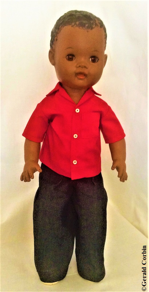 Several different head sculpts were proposed as siblings for Ideal’s Saralee Negro Doll after or during the time Saralee was made. It is unknown if these were widely produced or produced in low numbers. It is suspected that low numbers were produced. A Baby Brother with a brown cloth body (see the gallery photos), the featured 17-inch all-vinyl sister (that could be dressed as a girl or a boy), an all-vinyl approximately 16-inch all-original sister, and an identical doll dressed as a boy have been documented as Saralee’s siblings by collectors who own them. However, the redressed toddler boy might have originally been dressed by Ideal as a girl. See the other siblings in the gallery photos.