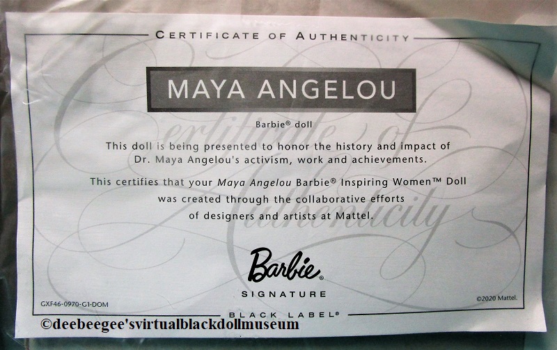The certificate of authenticity reads: “This doll is being presented to honor the history and impact of Dr. Maya Angelou’s activism, work and achievements. This certifies that your Maya Angelou Barbie® Inspiring Women Doll™ was created through the collaborative efforts of designers and artists at Mattel.”