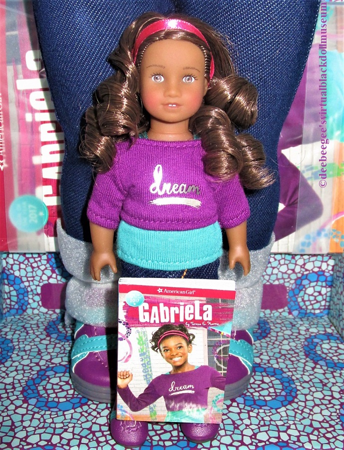 Other: This doll uses the same head sculpt as Sonali, Cécile Rey, and Melody. Gabriela McBride is American Girl’s first African American Girl of the Year Doll (GOTY). This 2017 GOTY doll represents a gymnast who struggles with a speech impediment that she is able to overcome with the aid of spoken word. A mini 6-1/2-inch all-vinyl version of the doll (shown with the larger doll in the featured image) was sold separately. The 18-inch version includes the book, Gabriela, by Teresa E. Harris. The mini doll includes a mini abridged version of the same title. Gabriela had several separately-sold gymnast-themed clothes and accessories. The doll was archived in July 2018. Read more about Gabriela McBride here.