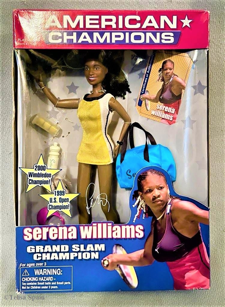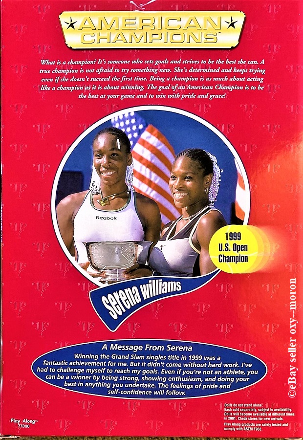 Other: The back of Venus’s box includes a picture of Venus Williams holding up the women’s Wimbledon trophy. Serena and her sister, Venus, are on the back of Serena’s box. A message from both tennis phenoms is on the lower portion of the back of their boxes. (A Venus and Serena Grand Slam Champions two-doll set was sold separately by Play Along with the same year 2000 box date.)