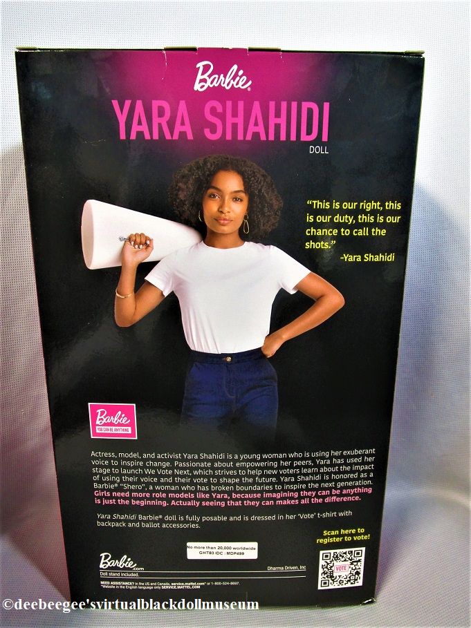 Clothes: Yara Shahidi Barbie wears a gray tweed-ish pants suit, a white tee with VOTE printed on the front, and white high-top sneakers. Includes a black backpack with an attached “I Voted” sticker. A 2020 ballot is held in the doll’s right hand.