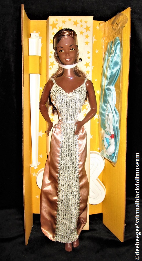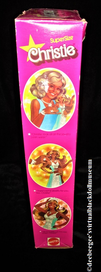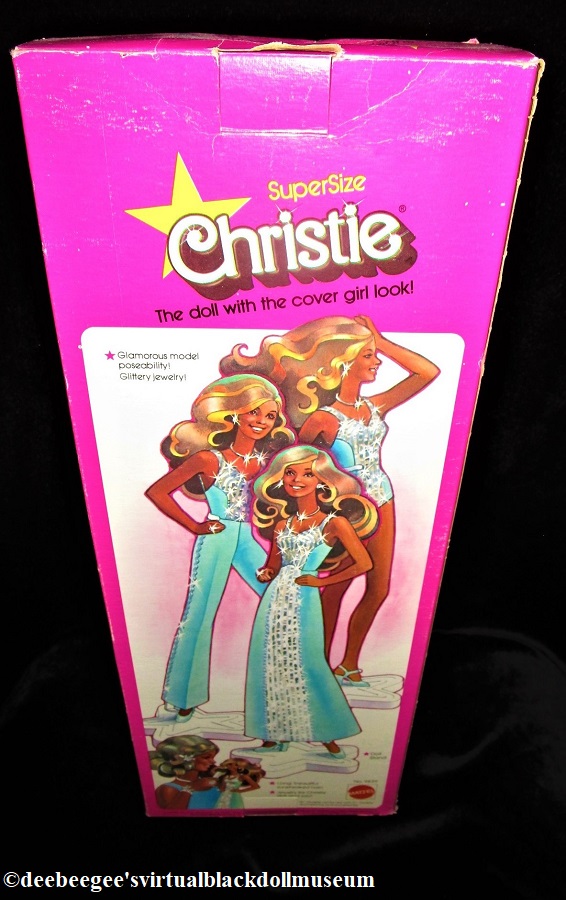 Other: SuperSize Christie is the only 18-inch Christie made by Mattel to date. The doll uses the Supersize head sculpt. The box illustrates the doll wearing an aqua fashion (the color the fashion is supposed to be). It is unfortunately common for this fashion to fade to pink.