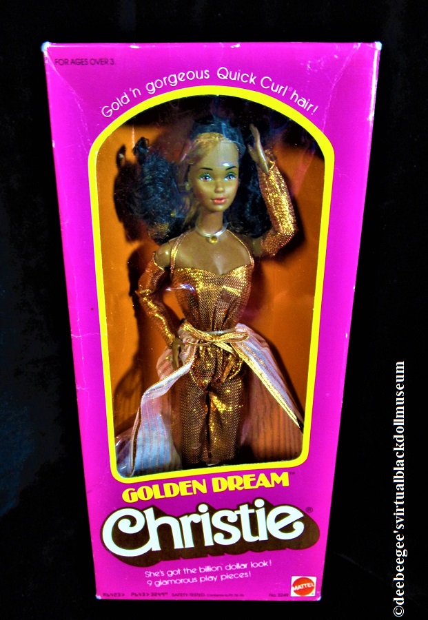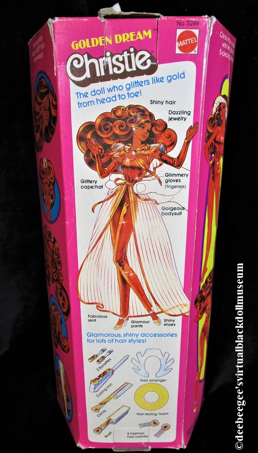 Other: Golden Dream Christie uses the Steffie head sculpt. The side panel box graphics illustrate several ways to style the doll’s Quick Curl hair. The back of the box illustrates the doll’s fashion and accessories.