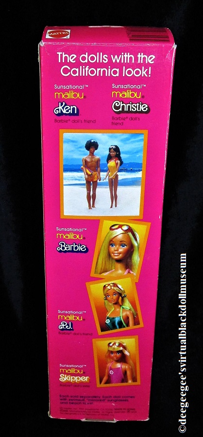 Other: Often referred to as “Afro Ken” because it is the first Black Ken with rooted hair, this is also the first Black male doll to be named Ken by Mattel. The Brad head sculpt was used for this doll. A headshot of Sunsational Malibu Ken is in the lower right corner of the front of the box. The doll is shown in a beach scene with Sunsational Malibu Christie on the back of the box.