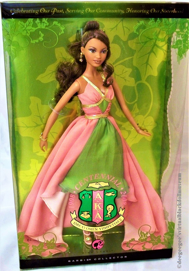 Other: In tribute to Alpha Kappa Alpha’s 100th anniversary, Mattel presented collectors with the AKA Centennial Barbie which was sanctioned by the AKA organization. The doll uses the Mbili head sculpt. The back of the doll’s box reads, “Alpha Kappa Alpha made history in 1908 when it was founded as the first sorority for Black women. In the following century, AKA has led social action initiatives and advocacy programs that have touched countless lives. Their overriding qualities of Energy, Sincerity, and Passion continue to empower this great Sisterhood to greater service, justice, and social good. In commemoration of a 100-year legacy of sisterhood and service, AKA Centennial Barbie doll celebrates all the women of the Alpha Kappa Alpha Sorority, Inc.” The doll was released on 08/14/2008.