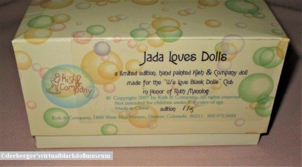 Other: Jada Loves Dolls was the 2013 club doll for the WeLoveBlackDolls (WLBD) Yahoo! Group, created in honor of group member, Ruth Manning, who transitioned on February 12, 2012. Helen Kish was one of Ruth’s favorite doll artists, and Helen knew her. The WLBD group commissioned Kish to create this tribute doll, which included the mini baby doll, Nile. Helen went above and beyond what was expected. She added the photograph pendant of Ruth that Jada wears and hand-signed and numbered each Jada. The included description card contains a photo of Ruth and reads: