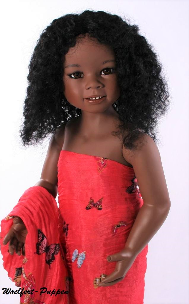 Hair, Eyes, Mouth: Black handmade wavy mid-back-length human hair wig with a side part, brown hand-blown glass eyes from Lauscha (a town in the district of Sonneberg, in Thuringia, Germany), open smile with separately molded teeth
