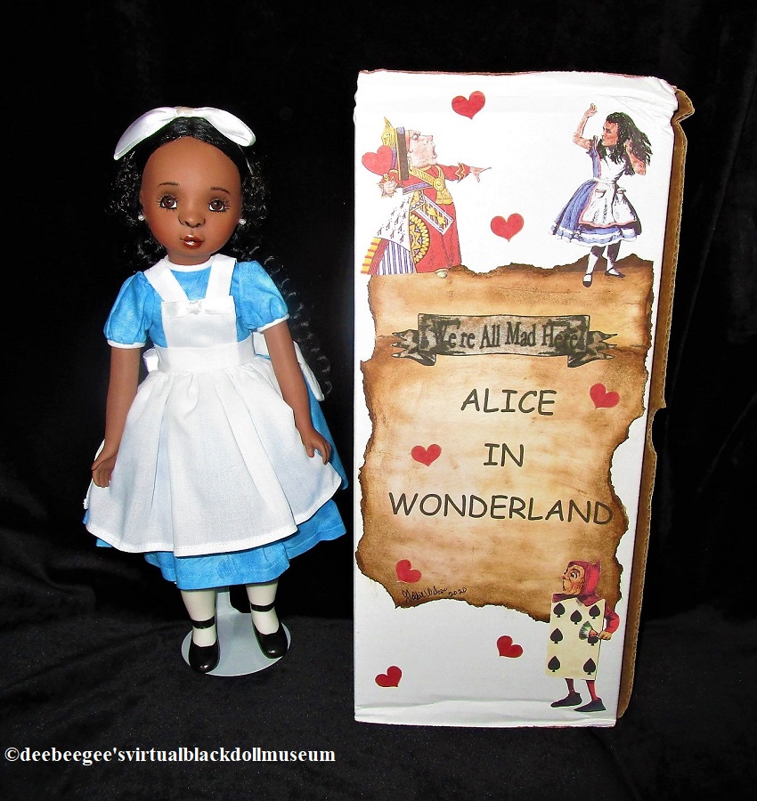Other: Alice in Wonderland is the souvenir doll for Maryland Society of Doll Collectors’ 2020 “Wonderland” luncheon which was to be held on April 25, 2020. Due to the COVID-19 pandemic, the luncheon was canceled. All who paid for the luncheon received this doll. The doll, the costume, and the box were designed and/or illustrated by the artist. As illustrated in the third slideshow photograph, Alice’s box is decorated with hand-drawn illustrations of the Queen of Hearts, Alice in Wonderland, and a card soldier – all as African American characters – a Black-doll-theme that had never been created until Goldie Wilson’s vision made Black Alice a reality.
