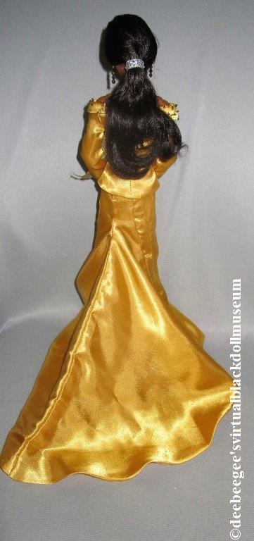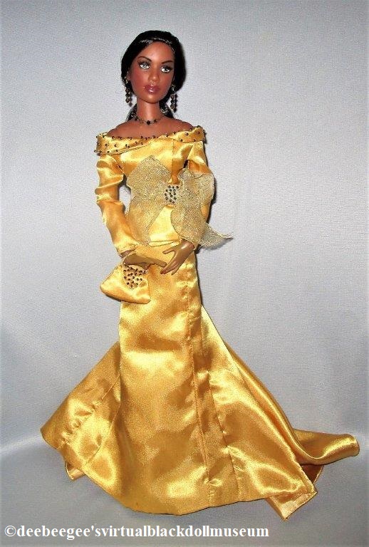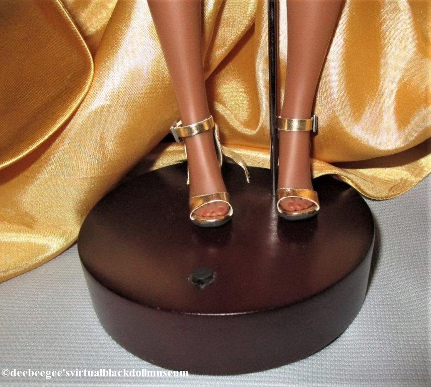 Clothes/Accessories: This lovely doll wears a two-piece gold satin dress with blue beads embellishing the collar and the gold mesh ribbon bow at the waist, has a matching gold handbag. The gold lamé ankle-strap high-heels have a gold satin bow in the back. Lady Sigma wears blue and gold drop earrings and a matching necklace. A straddle doll stand, the base of which contains battery-operated audio of the S. G. Rho song, and a certificate of authenticity were included with the doll.