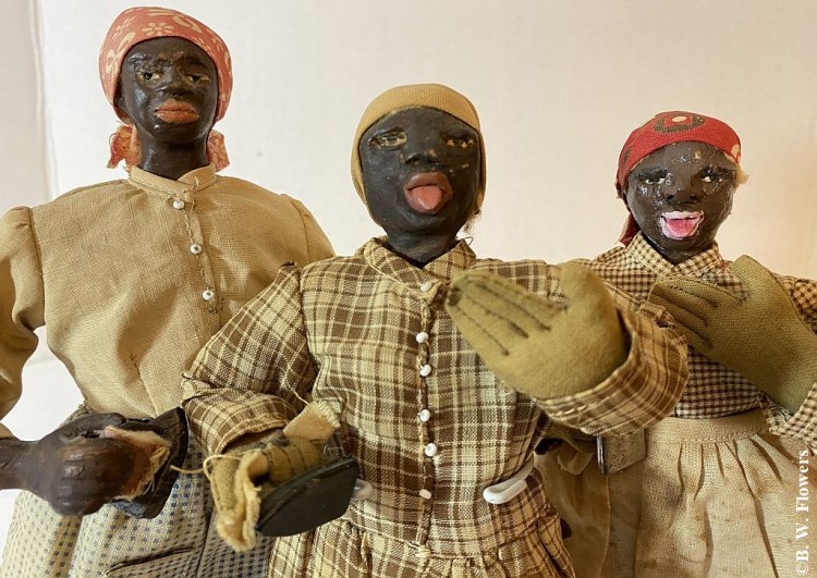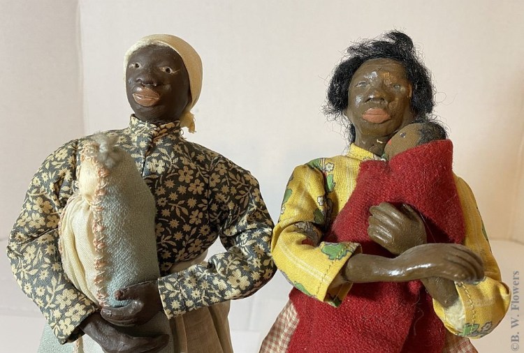 The sculpts of Blackman’s 1st generation dolls are well-defined and look like real people. As her dollmaking progressed, the 2nd and 3rd generation dolls of the same characters and of different characters have cruder sculpts with exaggerated facial features as illustrated in the dolls that represent Reverend Mayfield above and Mariah in the next photo.
