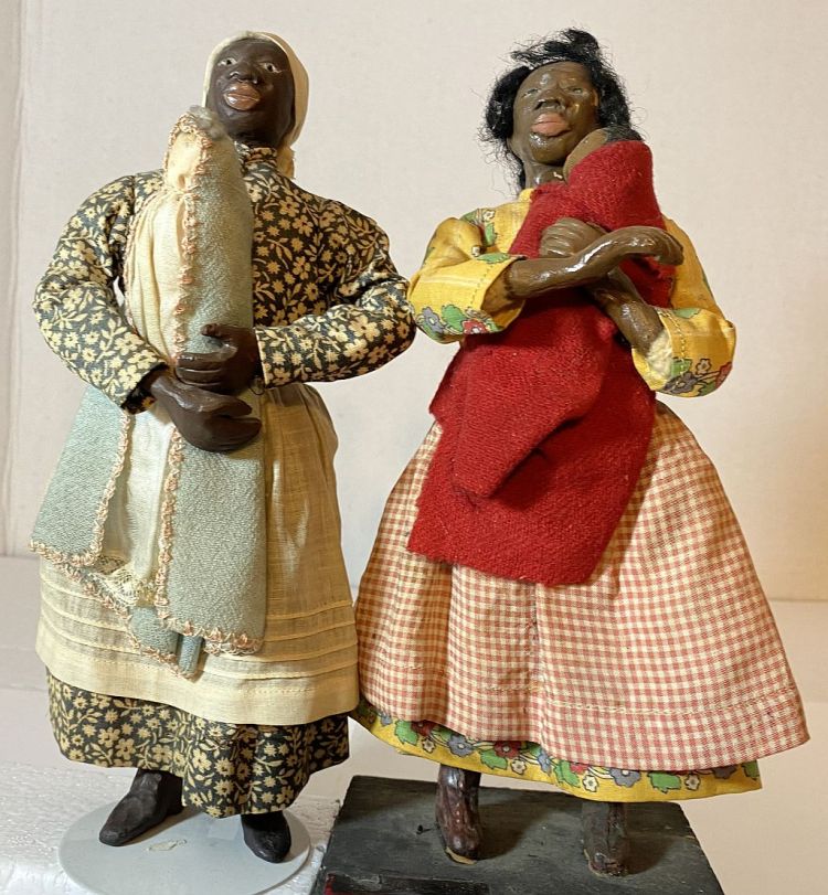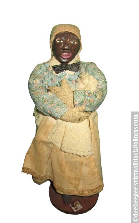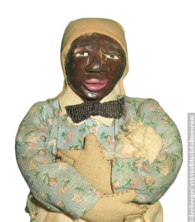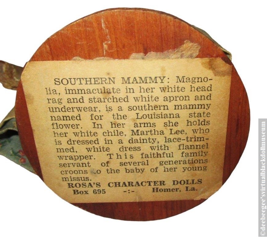 Magnolia was not named for a real person. She represents Black women who cared for white families. The Black baby was added to the doll on the right by the previous owner. She may not be a Magnolia; she might have originally been another character that held something other than a baby. See a 2nd or 3rd generation Magnolia below under “Two Additional Blackman Dolls.”