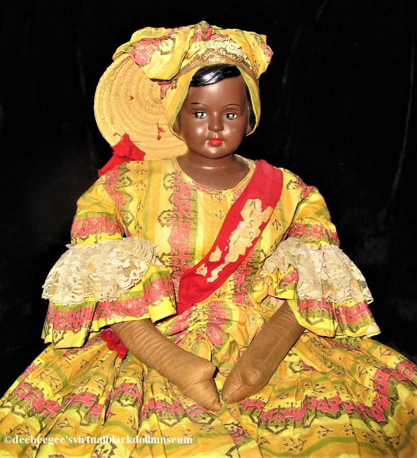 Clothes: Sewn-on island-style, full-length yellow/gold/green/orange-print dress has lace-trimmed bell sleeves and a red sash that reads “Miss H…” It is possible that the sash originally read “Miss Haiti”; the other letters were scratched off at some point. The skirt opens in the front to expose a portion of the off-white muslin two-tiered half skirt underneath. Red fabric serves as boots. The hair is covered with a tignon* (a combination head scarf and straw hat).