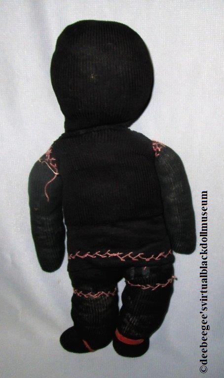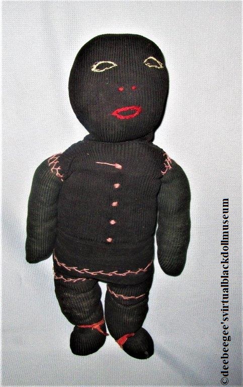 Other: Manufactured toys were considered a luxury for some families during the early 1900s and decades prior. Grandparents, parents, and others used household and found materials to make dolls for children. Sock dolls are examples of early handmade dolls. Facial features were stitched, and sometimes buttons were used for the eyes and/or nose. This example is a very primitive sock doll whose maker used only black socks, stuffing, embroidery thread, and ribbon to create.