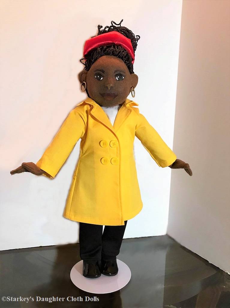 Other: This is a one-of-a-kind commissioned doll inspired by Amanda Gorman, the first person to be named National Youth Poet Laureate of the United States in 2017; the youngest White House inaugural poet having recited her poem, “The Hill We Climb,” during President Biden’s inauguration, and the first poet ever to perform during the Super Bowl.  The doll’s clothing and hairstyle were fashioned after the clothes and hairstyle worn by the poet at the inauguration of Joe Biden as the 46th President of the United States held on January 20, 2021. The final verse of the inaugural poem is embroidered in yellow thread on the back of the doll’s yellow coat.