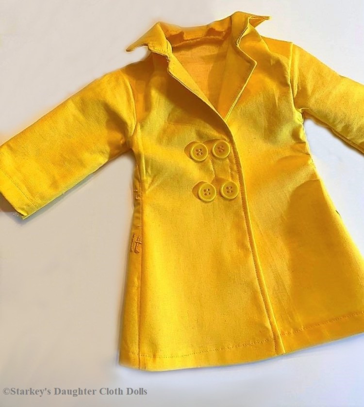 Clothes: White cotton shell, yellow full-length coat, black slacks, undies, black socks, black slippers, gold tone hoop earrings sewn to ear lobes