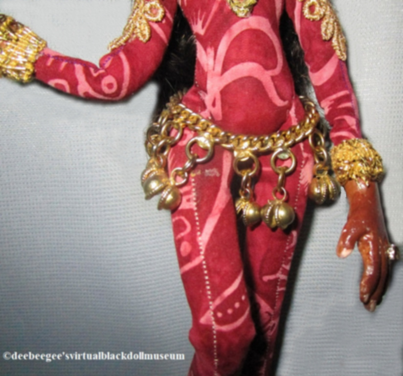 Clothes: Sewn-on burgundy and pink catsuit is embellished with gold brocade at the arms and lacy gold trim at the wrists; has a gold V-shaped neckline and wears gold-tone rings and earrings and handmade gold lamé shoes. The waist belt was made from a gold-tone bracelet.