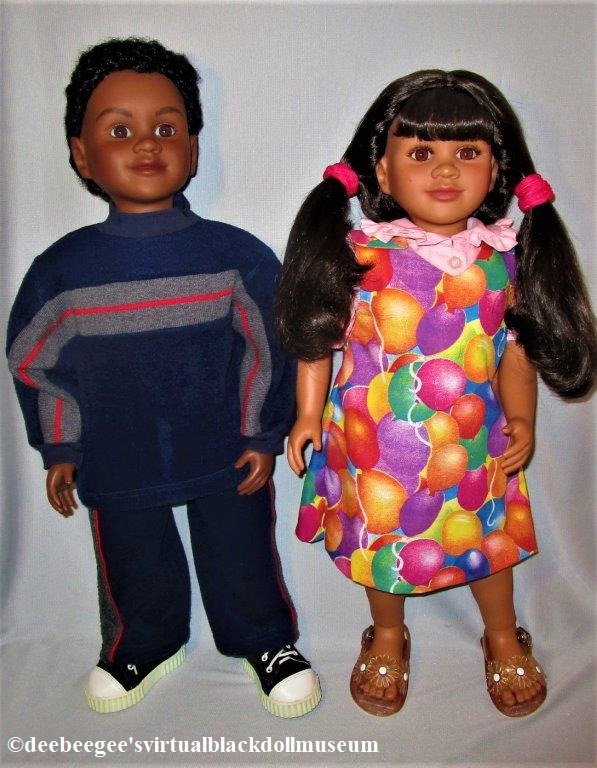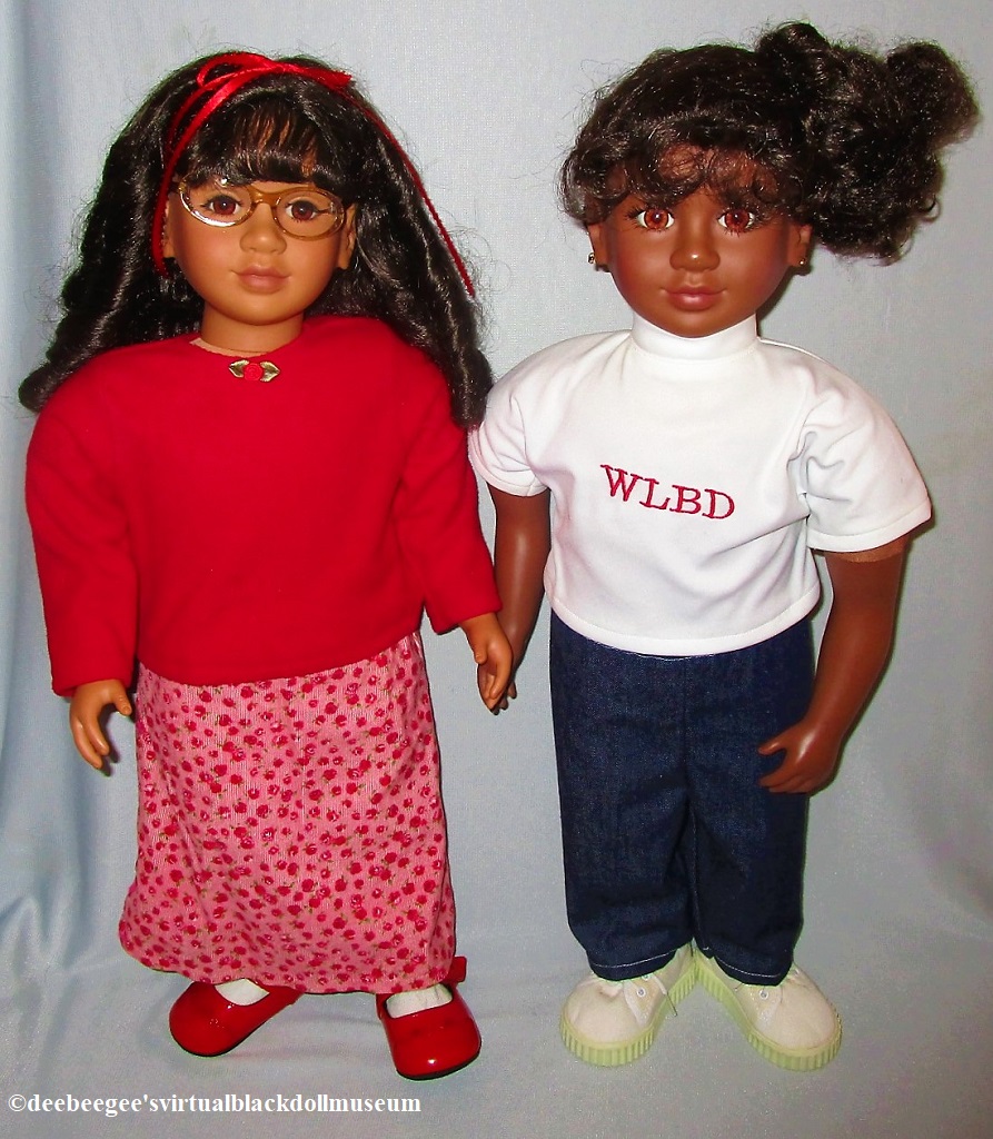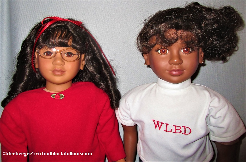 In 2004, several members of the now closed Yahoo email discussion group, WeLoveBlackDolls (WLBD), ordered from the My Twinn website a custom My Twinn doll with the same head sculpt (Teresa), the same complexion, wig style and color, and eye color specifications. Each member purchased My Twinn white socks and white canvas sneakers. A seamstress was commissioned to make identical white T-shirts and denim Capris for the dolls. “WLBD” was embroidered on the T-shirts. The doll served as the first annual club doll for the group. (See one of the doll’s photos in the gallery of this installation.)