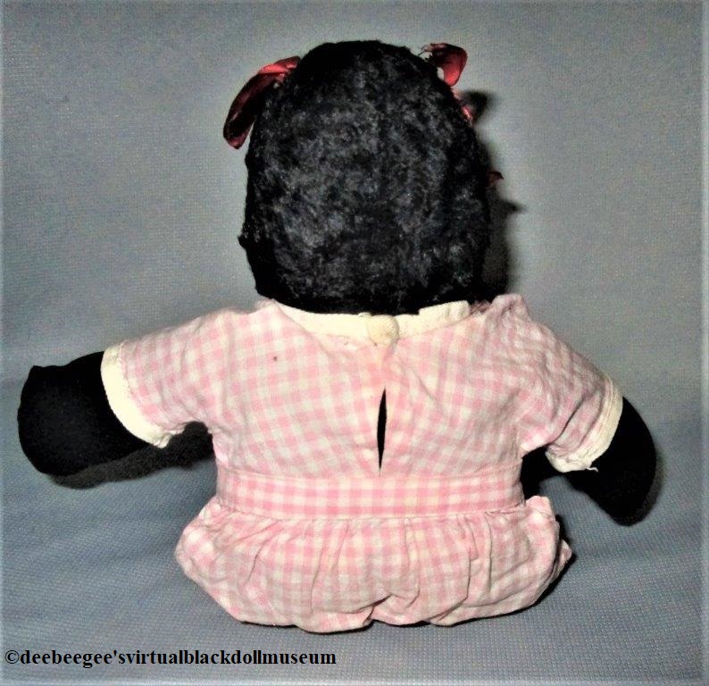 Hair, Eyes, Mouth: Black plush material, black painted eye’s glance to the doll’s right, painted circle mouth