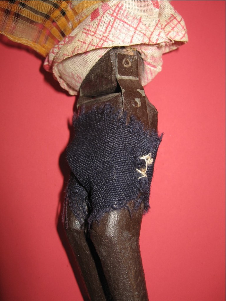 Other: The close-up profile shows the inserted nose and carved eyes and mouth, the painted earrings, and the screw used in jointing the shoulder. The profile picture shows the unusual hip joint and the slightly bent knees all the dolls have; the dolls can sit. An identically made 9-inch doll (without the headwrap) described as Haitian is identified and valued on page 89 in Wallace-Homestead Price Guide to Dolls by Robert Miller (Wallace-Homestead Book Company, 1982).