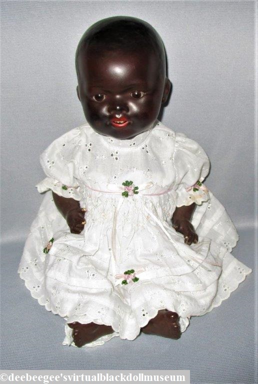 Clothes: These dolls were usually dressed in African tribal costumes with gold earrings, necklaces, bracelets, and anklets. This doll has been redressed as a girl in a white eyelet dress with matching pantaloons.