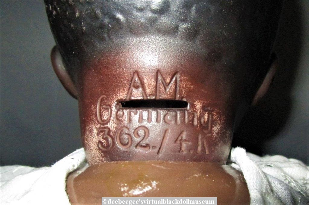 Other: The 362 Armand Marseille mold is considered rare. Only used for Black dolls, the fuller features of this mold depict African ancestry. There is a horizontal slit in the nape of the neck similar to a coin slot. It is uncertain if this was added by the manufacturer or by a previous owner that used the doll as a bank! Both ears are pierced, which is common.