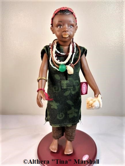 Clothes: Green Adinkra-print top, brown pants, bead-embellished kufi, several necklaces, and a bracelet; holds a seashell