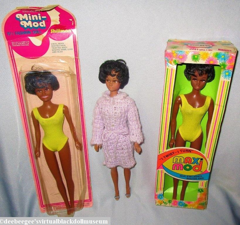 Maxi Mod is marked M&S / SHILLMAN (on the head); MADE IN HONG KONG (on the upper back). Mini-Mod is marked M&S / SHILLMAN (on the head) and M. & S. SHILLMAN, INC / MADE IN HONG KONG (on the back). The heads are vinyl; the body and legs are hollow plastic. Maxi Mod in the lavender sweater dress has firmer plastic arms, body, and legs. The boxed Maxi Mod has rubbery vinyl arms, a firm plastic body and legs. Mini Mod’s head is vinyl; the body and limbs are hollow plastic. All three have twist-and-turn waists. Black-rooted hair is styled in bubble cuts; brown painted eyes. Maxi Mod has rooted eyelashes. All have closed mouths. Maxi Mod in the lavender dress is redressed. The others wear their original yellow bathing suits.
