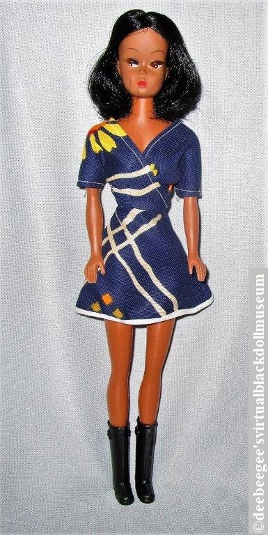 Marked MADE IN / HONG KONG (on the back). The head and arms are vinyl; the body and legs are hollow plastic. Has brown hair styled in a sparsely rooted low ponytail with bangs, black side-glancing eyes with heavy black eyeliner, and a closed mouth. Wears original orange short pants jumper belted at the waist with a black patent-leather belt, and red high-heel shoes. This dark-tan-complexioned doll was sold at Kmart originally for 96 cents.