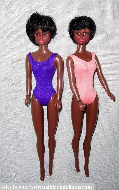Marked MADE IN HONG KONG. The heads are firm vinyl. The arms are firm plastic. The body and legs are hollow plastic. Both have a twist and turn waist. Black-rooted bubble cut hairstyles, brown painted eyes (the whites have faded or were never painted properly); closed mouths. Dressed in original bathing suits (purple and pink), released without shoes. These two have a black rubber band on their right wrist that possibly held a hangtag.