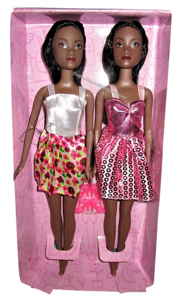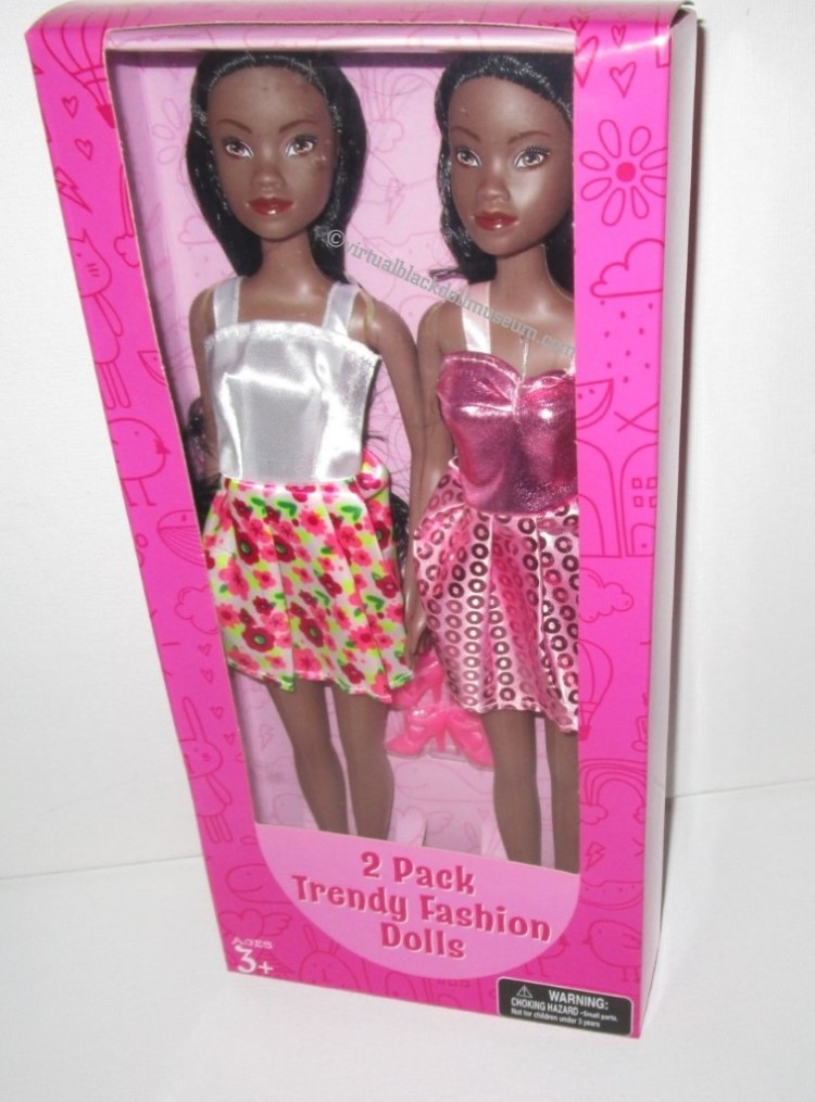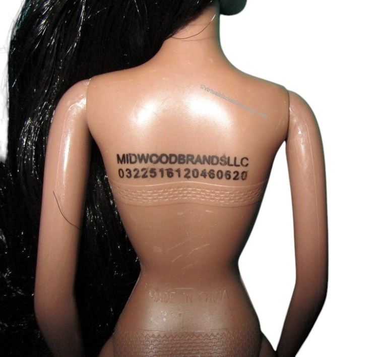 Two identical dolls, dressed in different synthetic material dresses, have ethnically correct facial features, sparsely rooted black hair (rooted around the sides and top), bendable arms that do not hold a pose, and hollow vinyl legs. The heads are marked: CHINA. The upper backs are stamped: MIDWOOD BRANDSLLC/0322516120460620. Midwood Brands, LLC is a private-label and discount brand company, with its parent organization being Dollar Tree. The dolls were sold at Family Dollar.