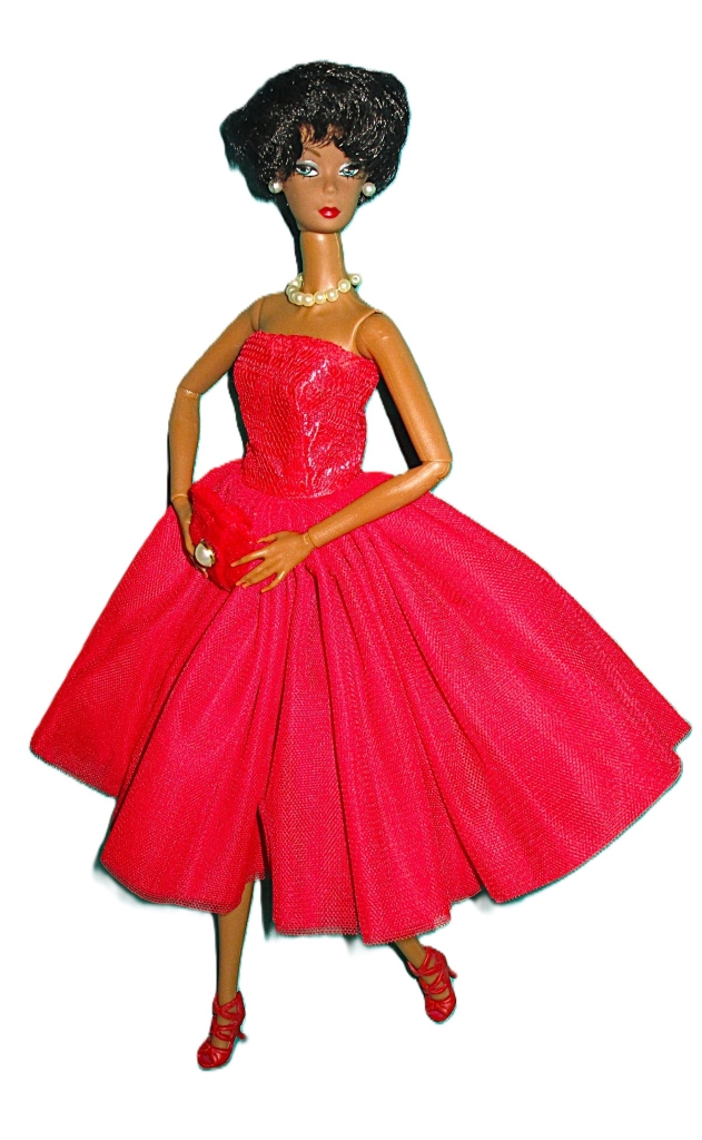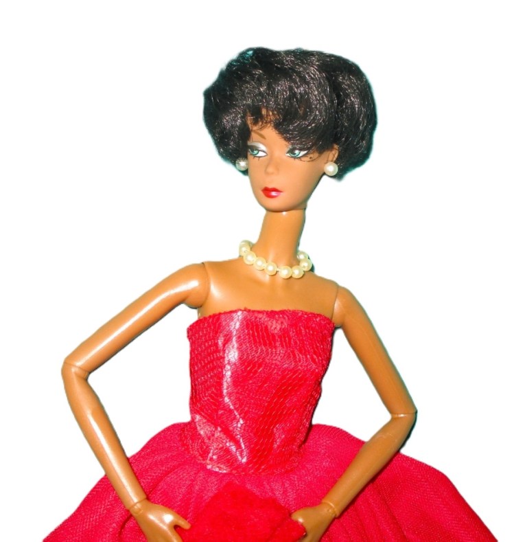 This 12-inch Barbie clone was sold nude by a Chinese merchant. The vinyl head sculpt is similar to #1 Barbie’s with black rooted bubble cut hair over a painted black scalp. The raised side-glancing eyes are sculpted and painted blue with light blue eyeshadow, heavy black eyeliner above the upper lids, and painted lower eyelashes. The closed mouth has red lip color. The arms and lower legs are solid vinyl, while the body and upper legs are hollow plastic. The doll has four extra points of articulation at the elbows, wrists, knees, and underneath the breasts, but only slight movement underneath the breasts. Dressed by the curator in a red party dress, a handmade felt clutch, and red high-heeled shoes, jewelry includes pearl stud earrings and a handmade pearl necklace.