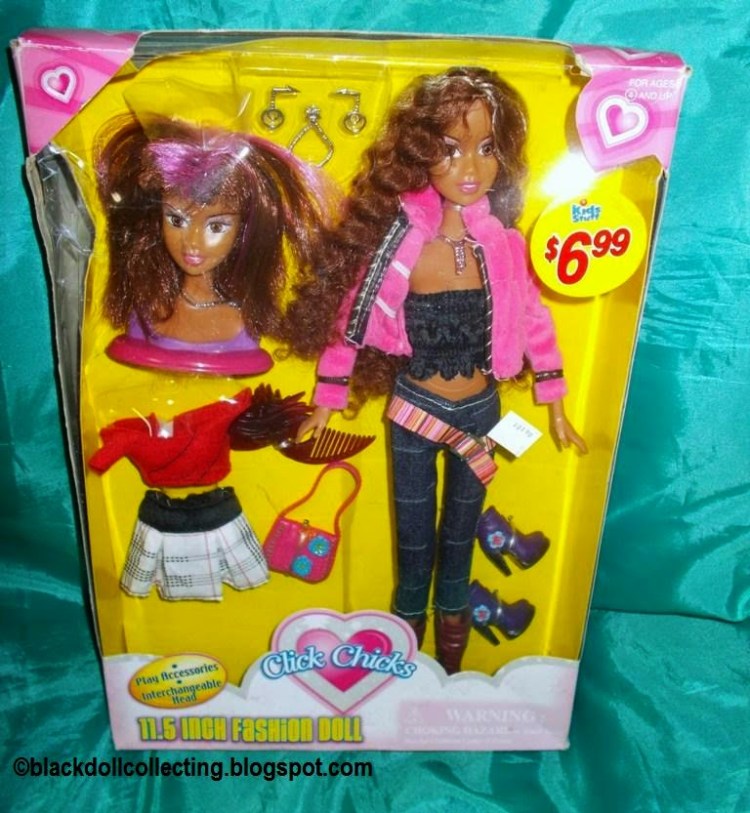Click Chicks, a doll with an interchangeable head. The doll has reddish-brown wavy, rooted hair; brown-painted eyes, and a closed mouth. The extra head has brown straight hair with pink bangs. Doll wears a black halter underneath a pink fleece jacket, denim pants, a pink/purple/white striped belt, brown mid-calf boots, silver hoop earrings, and a silver necklace. The extra fashion includes a red blouse, a plaid mini skirt, and a pink shoulder bag with two blue flowers painted on the front. Additional accessories are an extra pair of brown anklets and a set of silver jewelry (earrings and necklace).