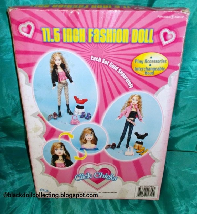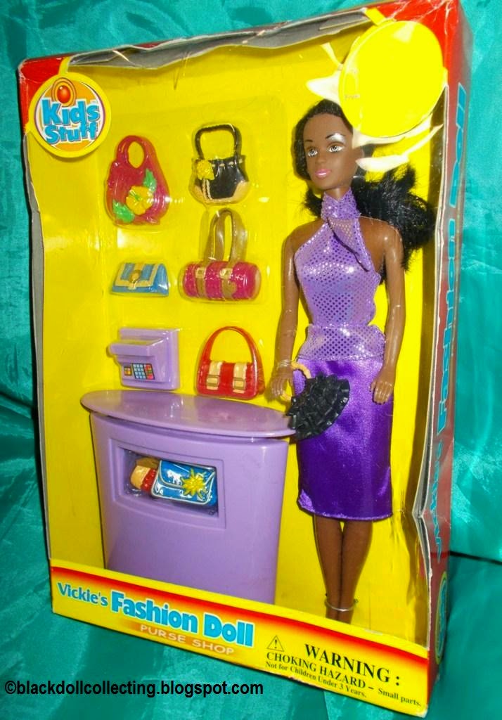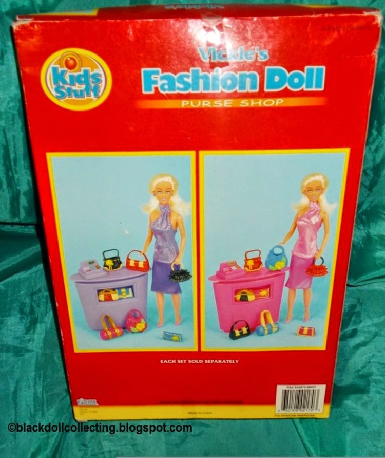 Vickie’s Fashion Doll Purse Shop, distributed by Excite and sold by Kids Stuff, has black rooted hair, painted brown eyes, and wears purple stud earrings that match the purple halter and pencil skirt. Vicke holds a black handbag. Pink high heels are attached to the box liner along with five purses for Vickie’s Shop, with two extra purses in the display case of the purple counter. A purple cash register is also included. The back of the box features white versions.