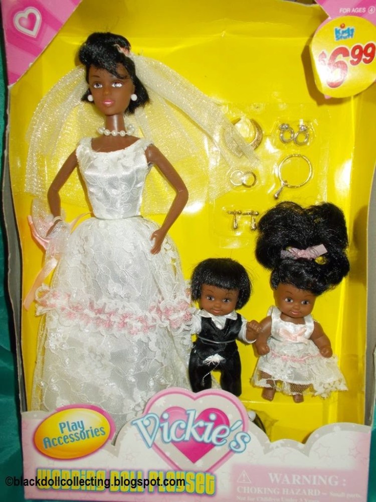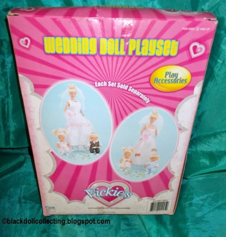 Vickie’s Wedding Doll Playset includes the 11-1/2-inch doll and two approximately 5-inch dolls to serve as the ring bearer, a boy, and the flower girl. A jewelry pack of two sets of extra earrings and necklaces, and two bracelets, is attached to the box liner. Vickie wears faux pearls and pearl stud earrings to accessorize the wedding gown. Vickie was one of the company’s popular doll characters. The back of the wedding set box illustrates two blond sets.