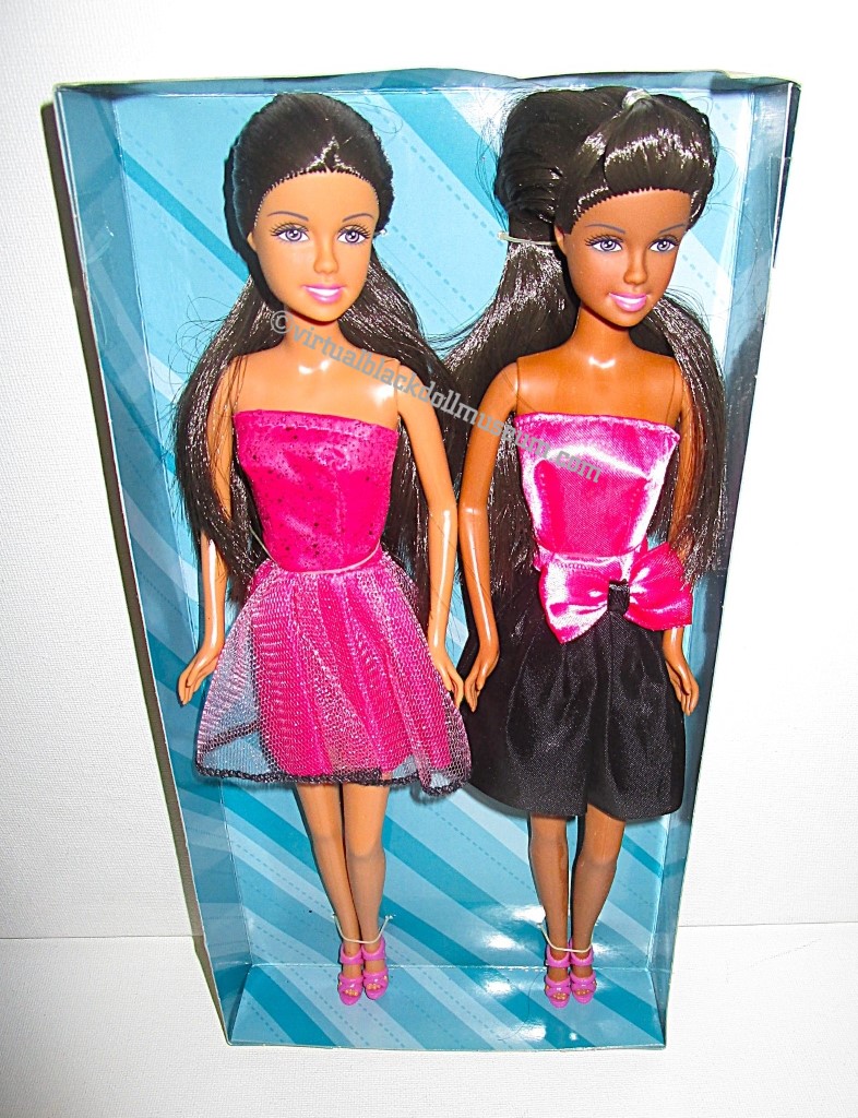 The same head sculpt but different complexions were used for the Kid Connection dolls. The light-complexioned doll’s straight, below-the-waist black hair hangs loose. The medium-complexioned doll has a top ponytail, and the rest hangs loose. Both have light brown painted eyes with painted upper and lower eyelashes, and open/closed mouths with painted teeth areas. They feature soft vinyl heads, arms, and legs with click-bend knees; rigid plastic bodies, and the usual five points of articulation. Dressed as shown in different styles of dark pink and black dresses and pink high-heeled shoes.