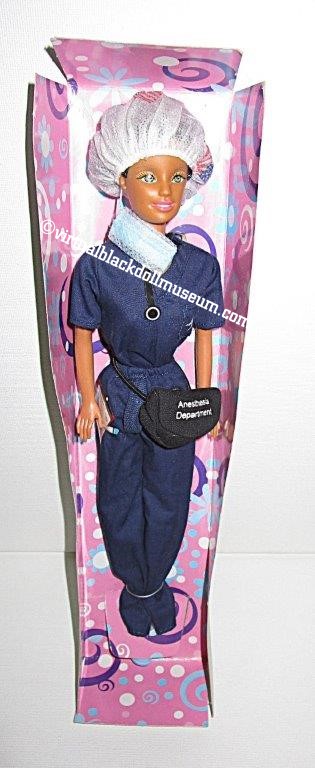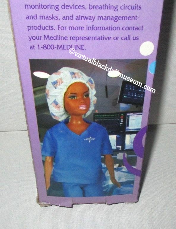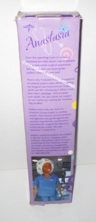 Marked MADE IN CHINA across the upper back. The head, arms, and legs are vinyl; the body is rigid plastic. The black rooted hair is styled in a high ponytail. The gray eyes are painted with painted upper and lower eyelashes and pink eyeshadow. The open/closed mouth has coral lip color and a painted tooth area. The ears are pierced. Anastasia wears a USA flag-printed hair net, a light blue surgical mask, dark blue surgical scrubs, white socks, and light blue shoes. A stethoscope sticker hangs from the neck, and a patient chart and pencil sticker are attached to the pants near the right hand. A black medical bag marked Anesthesia Department in white letters is attached to the waist. Anastasia has the usual five points of articulation and an articulated waist. The doll’s backstory of working in the operating room, the recovery room, and providing patient care during and after surgical procedures is on the back of the box. Of note, a headshot image of a similarly dressed doll that uses the Asha head sculpt by Mattel is on the back of the box.