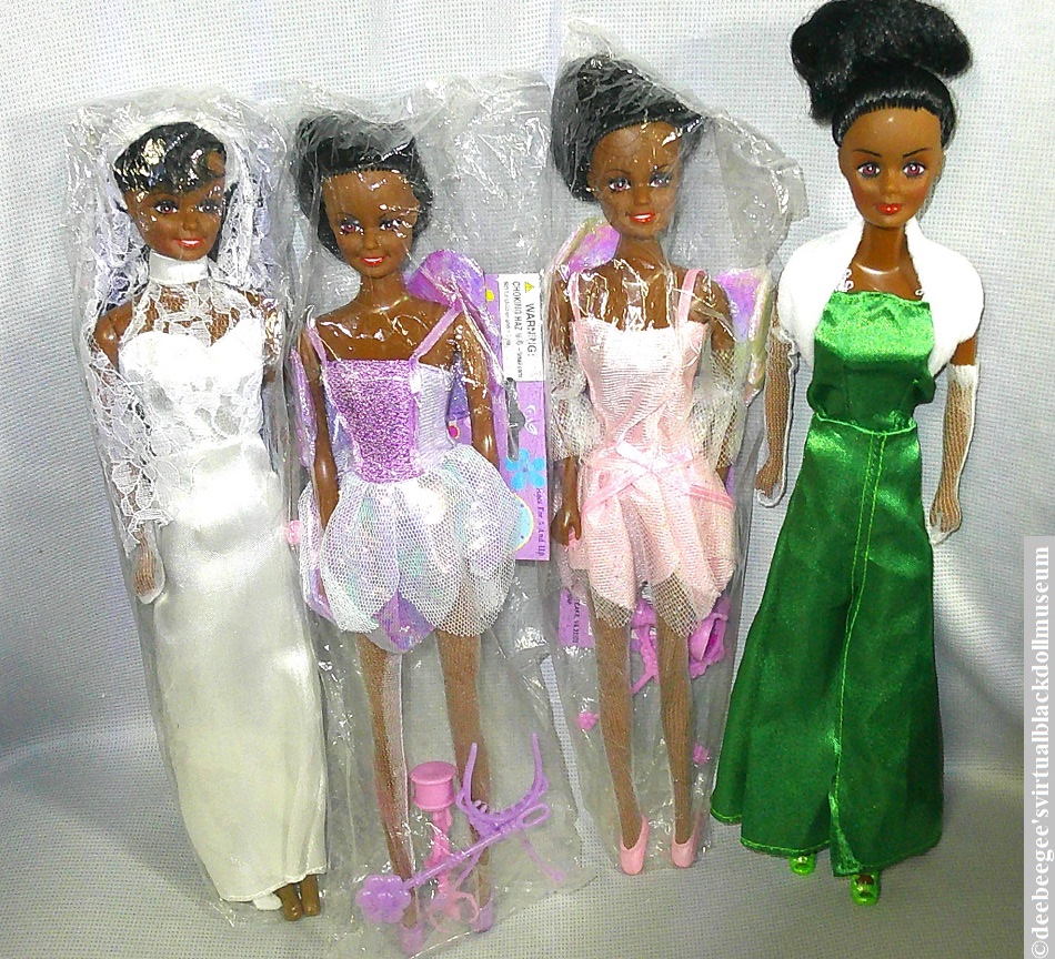 Unmarked Poseable Patti Dolls (Poseable Patti’s Wedding Bride, Poseable Patti Ballet Dancer wearing a purple costume, Poseable Patti Ballet Dancer wearing a pink costume, and an unkown gown-wearing Poseable Patti) distributed by Greenbrier International were sold at Dollar Tree stores in 1992. The quality of these dolls is superior to 11-1/2-inch fashion dolls sold at Dollar Tree in today’s (2020s) market. The brides and ballerina share the same head sculpt with open smiles and painted teeth. The doll in the green gown has a different head sculpt, a closed mouth, outlined lips, and wears replaced shoes. Each doll has black-rooted hair, brown-painted eyes, and painted upper and lower eyelashes. Except for the replaced green shoes, all clothing is original.