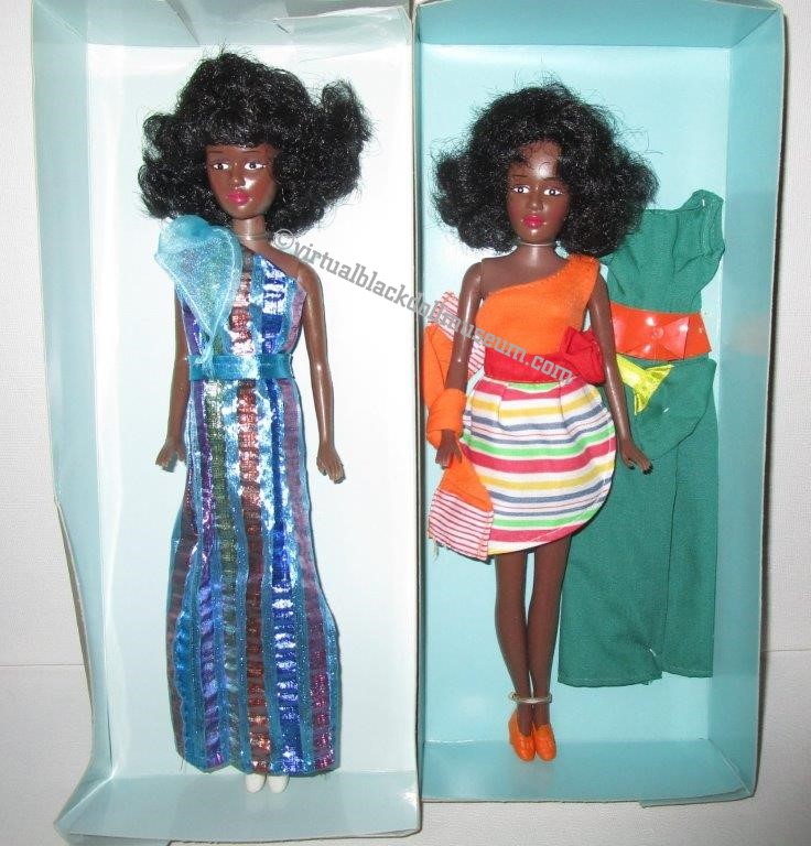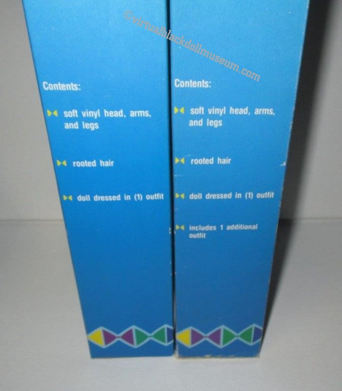 Stock number 11534 includes only the doll. Stock number 11510 includes the doll and one extra fashion. The black rooted curly hair is shoulder-length and styled the same. They have black-painted eyes with painted lower eyelashes and closed mouths with red lip color. The heads, arms, and legs are soft rubber-type, nonhollow vinyl. The bodies are rigid plastic. Both dolls are dressed in their original fashions as shown. The articulation is at the usual five places: neck, arms, and upper legs with bendable knees (click-bend).