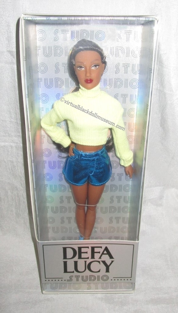 The head is marked DF55. The Defa Lucy Studio doll uses the same head sculpt as the Defa Lucy Fashion Girl. This 12-inch multiarticulated doll has dark brown rooted hair with the top pulled back into a small ponytail and the rest hangs loose, brown-painted eyes, a closed mouth with dark lip color; wears a yellow knit cropped turtleneck sweater, metallic turquoise shorts, and light blue ankle boots. The wrists rotate, and the elbows and knees bend.