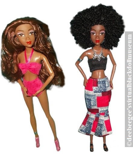 Two dolls appear to use the same head sculpt as Mattel’s My Scene Jai. The doll in the two-piece swimsuit has long-auburn-rooted hair. The other doll has a tightly coiled and closely rooted black Afro. Both have brown-painted eyes with heavy eye shadow, closed mouths, and red lip color. They are fully articulated but use different bodies. The doll on the left has a sturdier body with more shapely legs than the thinner body used for the doll on the right. They are both articulated underneath the breast area. Both wear their original clothes. Jai was considered the most difficult to find during Mattel’s My Scene Dolls’ popularity. See an original My Scene Jai here.