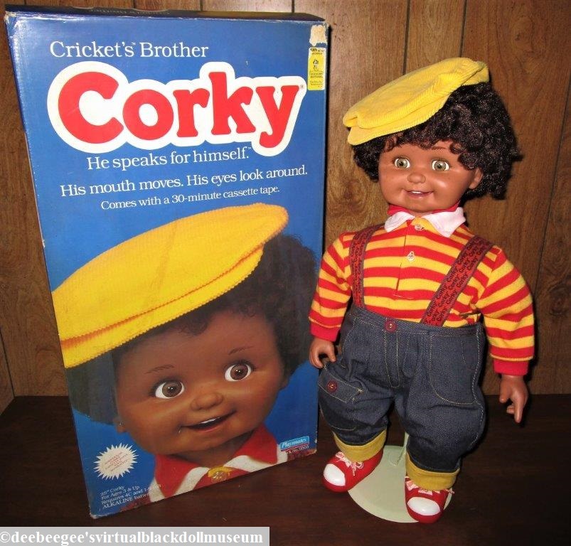 Other: Each doll came with a 30-minute tape that controls the talking and the eye and mouth movements when the tape is inserted into the tape recorder in their backs. (View a 1987 Cricket commercial below the gallery.) Requires four C batteries and one 9-volt battery. Extra outfits, personalized chairs, cassette tapes and books, and other accessories were sold for Cricket and her brother, Corky.