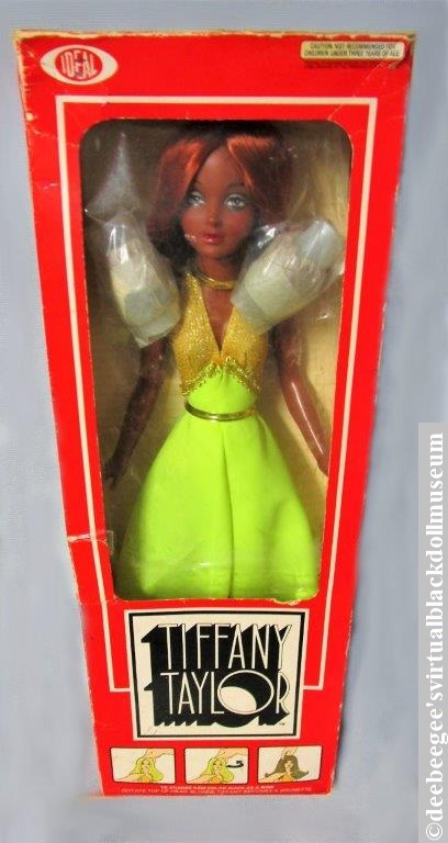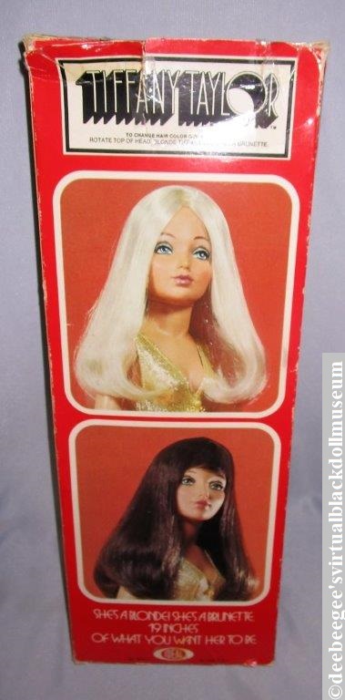 Other: Brunette Tiffany becomes a redhead when the swivel skull cap is rotated. Black Tiffany Taylor uses the White doll’s box, the bottom of which describes the White doll’s change hair color feature as, “To change hair color quick-as-a-wink rotate top of head. Blonde Tiffany becomes a brunette.” A Tiffany Taylor commercial only featured the White doll.