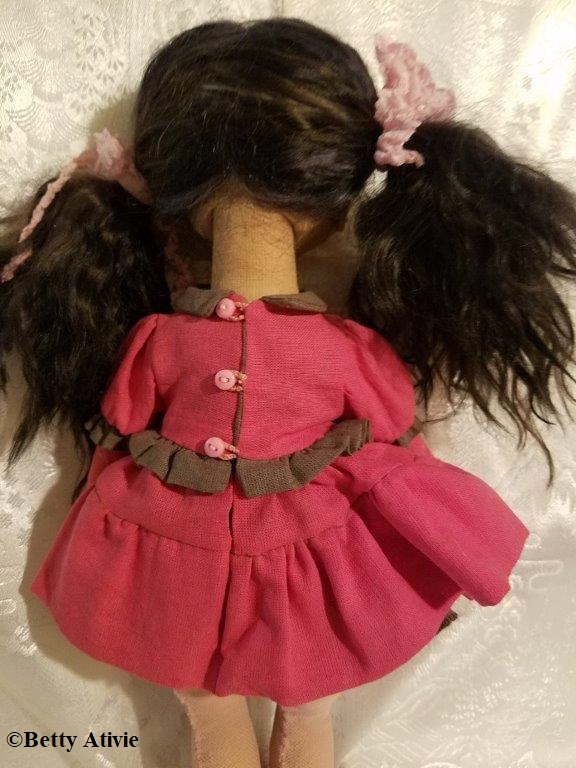 Hair/ Eyes/Mouth: Natural goat hair accented with light pink silk hair ribbons, beautifully painted facial features with acrylic-painted blue eyes, and acrylic-painted red lips